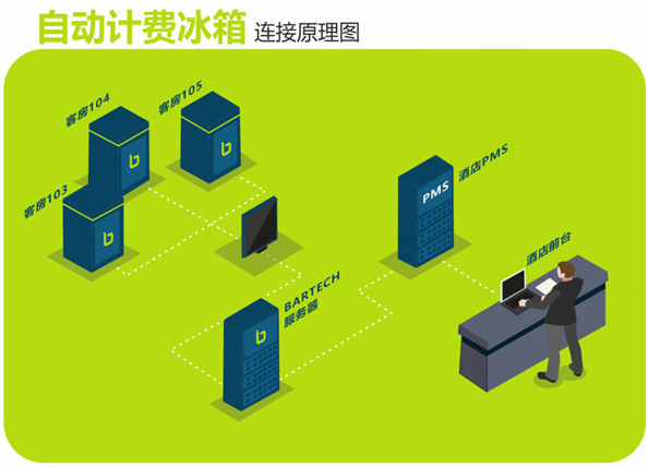 我们的自动计费冰箱通过有线或无线的网络通讯方式连接到装有我司自动计费系统的服务器上,我司的服务器同时连接于酒店的物业管理系统与装有我司自动计费系统的酒店前台电脑。我们的自动计费冰箱能实时记录冰箱内所有饮品状态的信息,并自动实时记录酒店客人在客房冰箱内消费饮品的动态,对消费饮品实现实时自动计费,同时将这些信息自动实时传送到酒店物业管理系统上。使用我们的自动计费冰箱能大大降低酒店的管理成本。